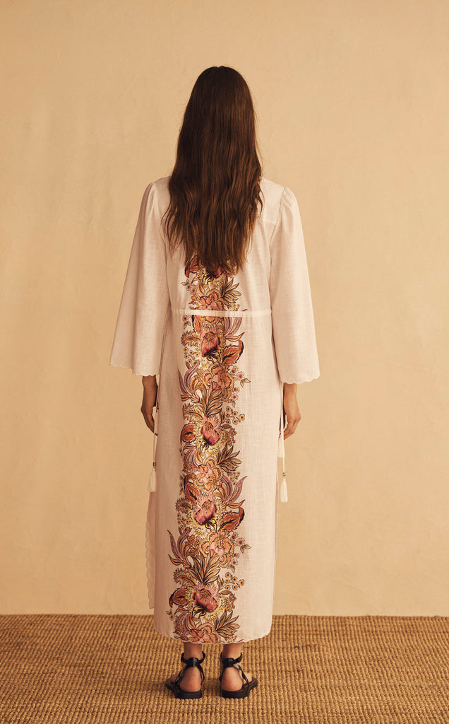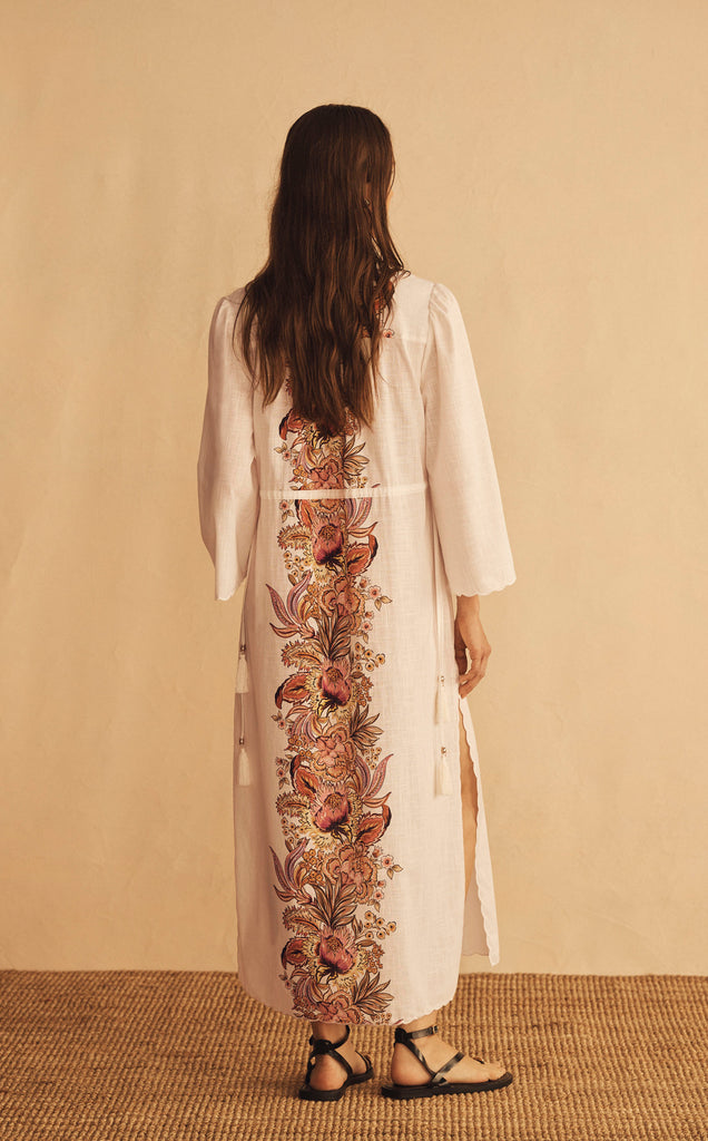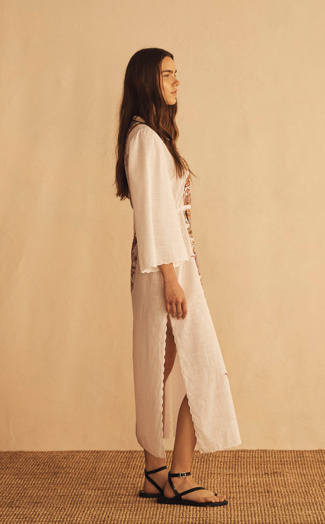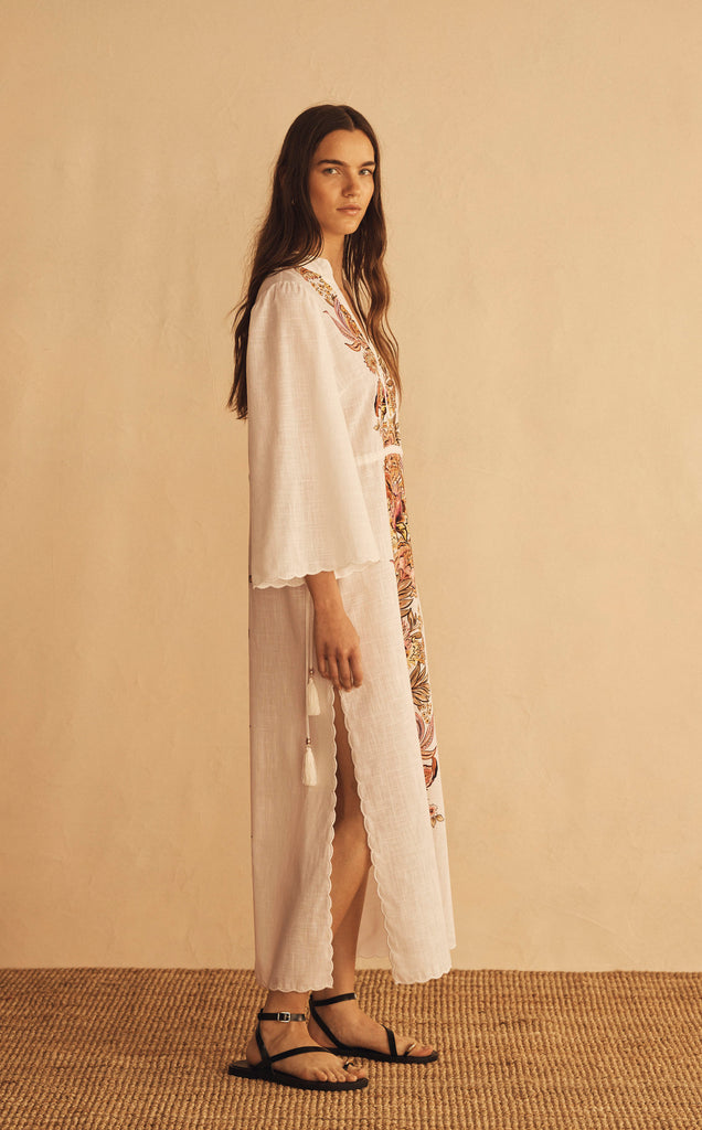 A relaxed, yet refined silhouette, the Scallop Tunic Dress with stitched scallop trim features a classic V neckline, soft bell sleeve and knee length side splits. Self-fabric drawcord waist is adjustable to personal fit. Seamlessly transition from beach coverup to cocktails with the Scallop Tunic Dress. The perfect addition to a capsule wardrobe for refined yet relaxed year-round wear. Pair with the BISCOTTO Half Slip for additional coverage if desired.