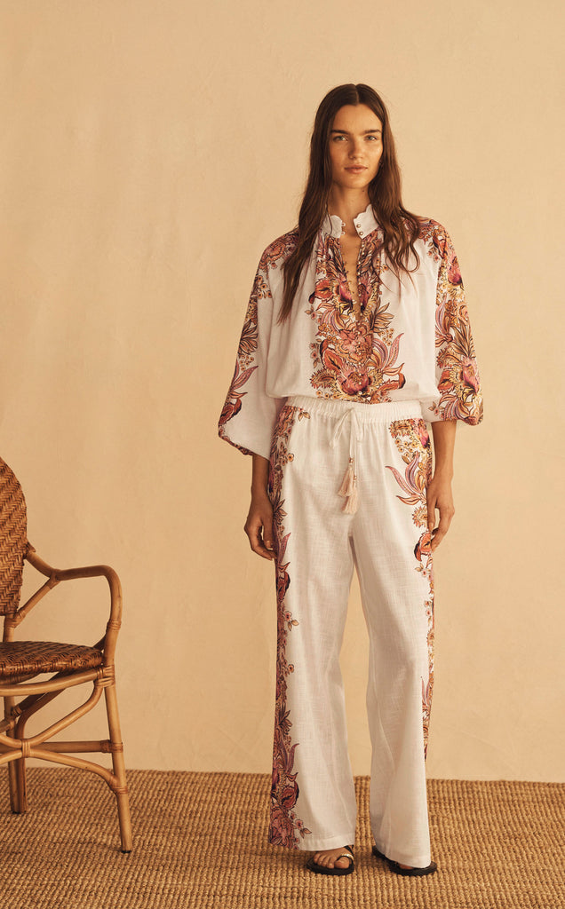 Designed for everyday wear the Straight Leg Pant is the perfect complementary staple. Featuring elasticised waistline with drawstring tie with bead and tassel detail. Pair with this season’s favourites or style with coordinating Scallop Billow Sleeve Blouse.