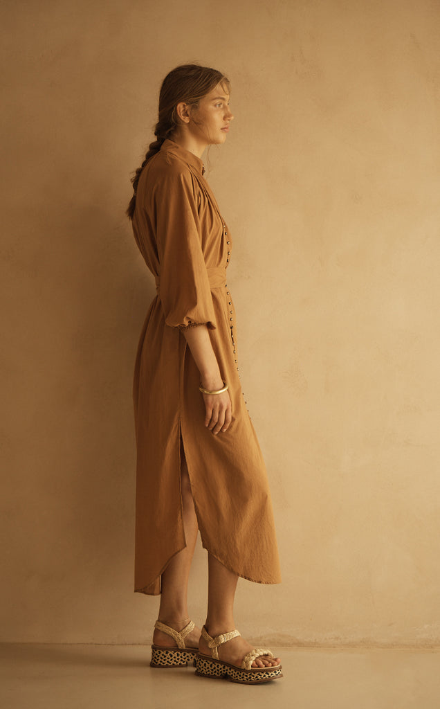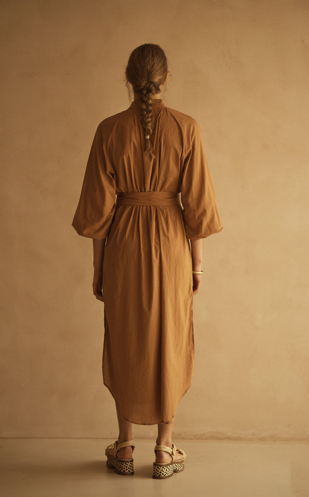 Adding the versatility of day to night dressing, the Billow Sleeve Resort Maxi is a relaxed, yet refined silhouette. Featuring a high collar button through front with rouleau loop fastenings, adjustable self-covered belt and full billow sleeve. This maxi length dress is designed to be worn tied closed as a dress, or wear open over swim.