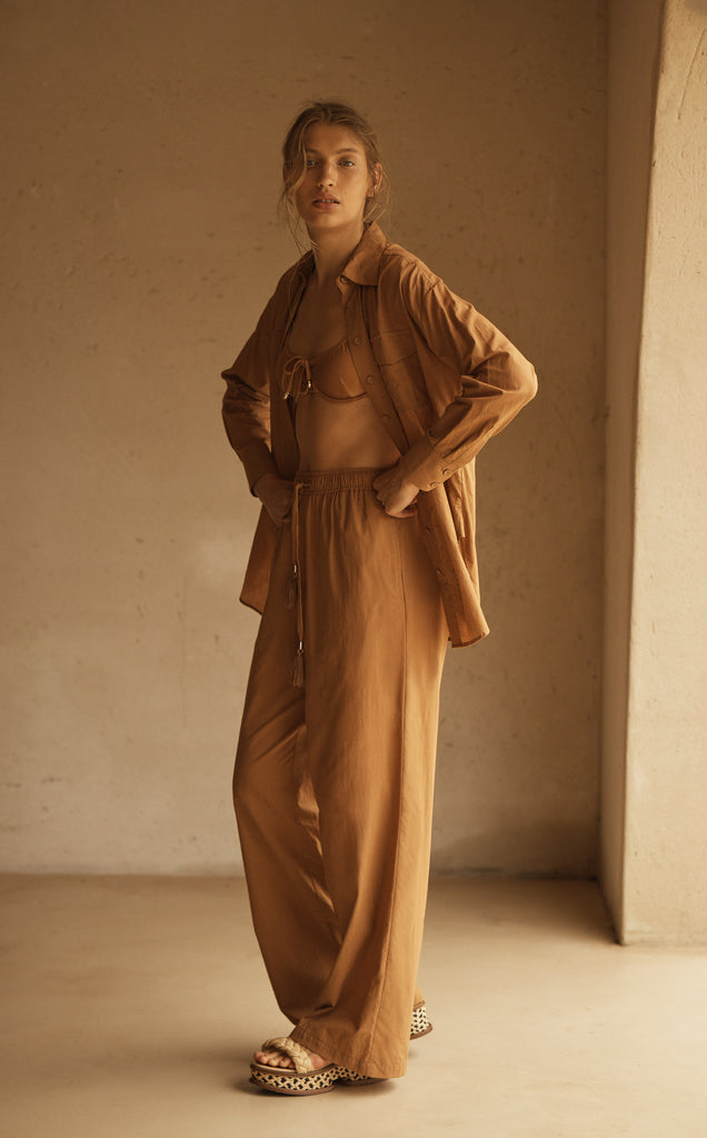 The Long Sleeve Safari Shirt is a perfect companion piece featuring a classic collar, double breasted chest pocket and centre front button closure. Both transeasonal and versatile in styling, layer over swim or pair with Straight Leg Pant to complete this look.