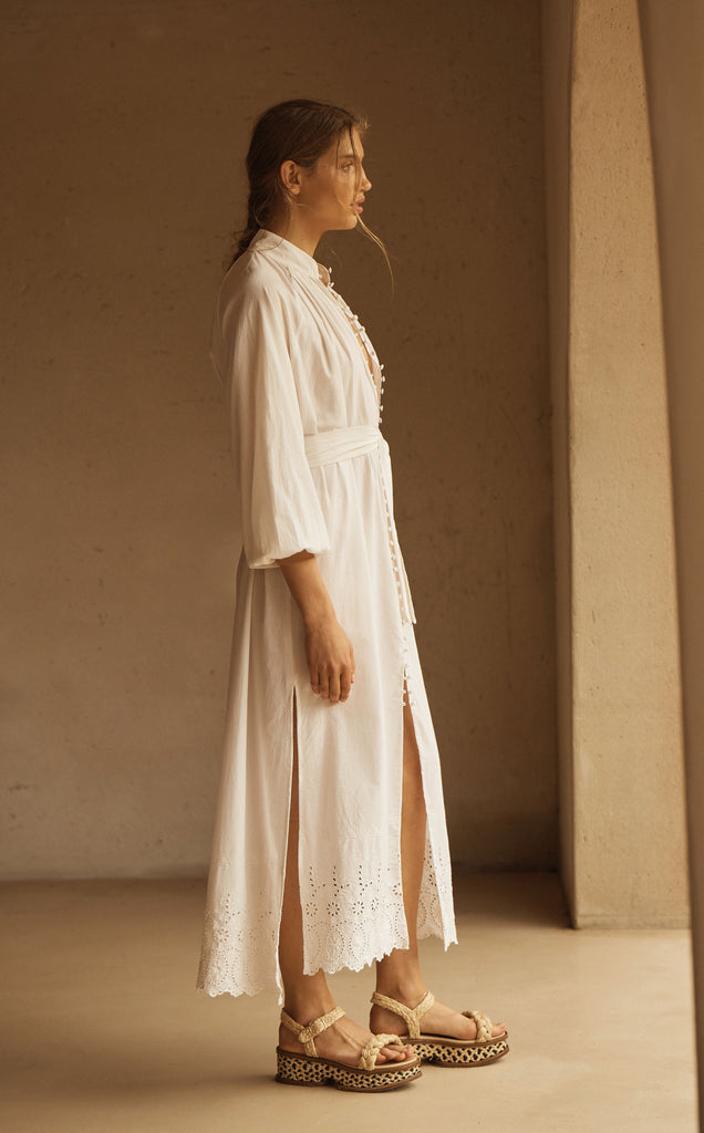 Offering the versatility of day to night dressing, the Billow Sleeve Resort Maxi is a lightweight relaxed, yet refined silhouette. Featuring a high collar button through front with rouleau loop fastenings, adjustable self-covered belt and full billow sleeve. This maxi length dress is designed to be worn tied closed as a dress, or wear open over swim.