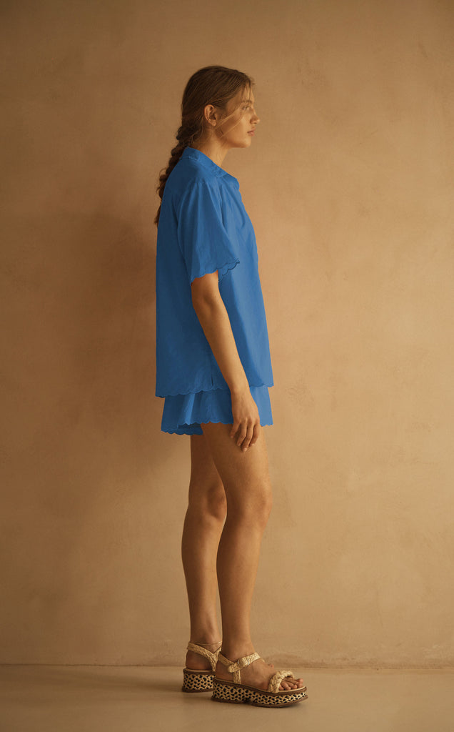 A summer wardrobe essential. The Scallop Short Sleeve Shirt is a relaxed boxy fit and features mother of pearl button detailing and short sleeves. Wear it unbuttoned over your swimsuit or style with coordinating Drawstring Short for effortless chic.