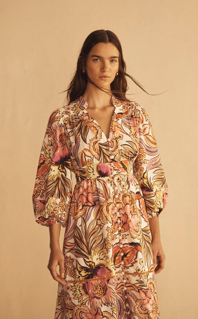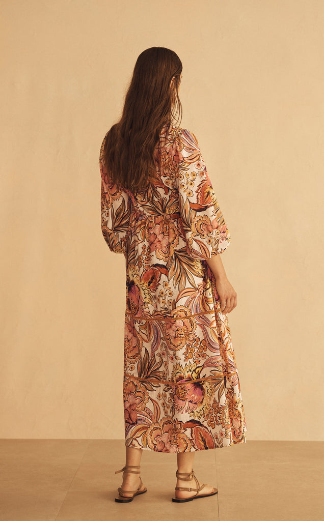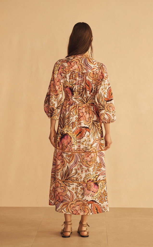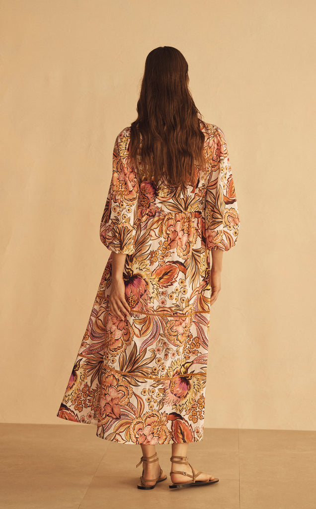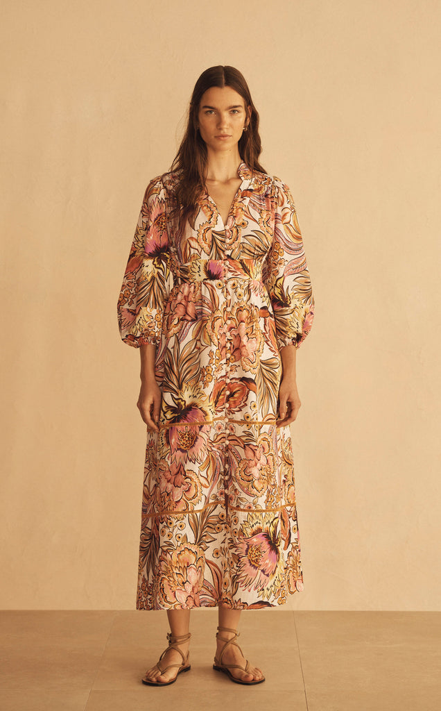 For the modern romantic, the Blousson Tiered Midi Dress features a fitted bodice, tiered skirt with ladder trim accents, a relaxed V-neckline, blousson sleeves and finished with a crochet button through front. A timeless silhouette, the Blousson Tiered Midi Dress is an elevated style perfect for any occasion.
