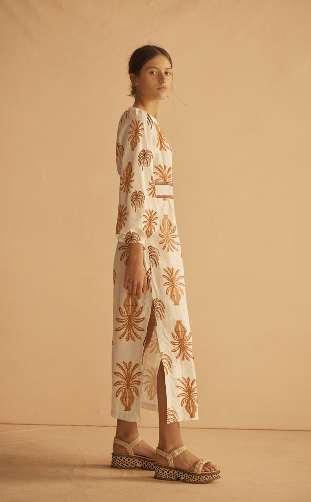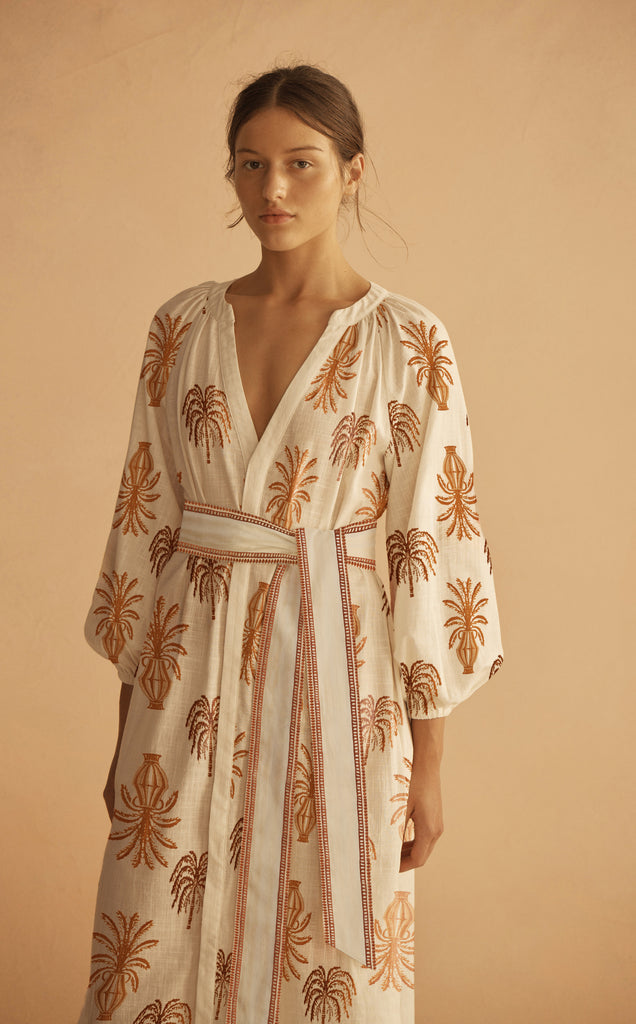 Contemporary sophistication with timeless appeal, the Plunge Maxi Dress is an elevated silhouette designed to move through the seasons. Featuring plunge neckline, billow sleeves, covered front placket and coordinating embroidered ladder trim belt for subtle definition. Embroidered palm-tree inspired motifs add a refined artisanal touch. Style with a simple sandal or block heel.