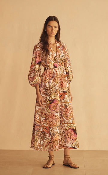 For the modern romantic, the Blousson Tiered Midi Dress features a fitted bodice, tiered skirt with ladder trim accents, a relaxed V-neckline, blousson sleeves and finished with a crochet button through front. A timeless silhouette, the Blousson Tiered Midi Dress is an elevated style perfect for any occasion.