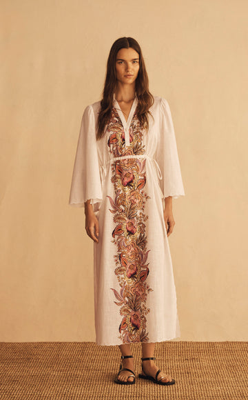 A relaxed, yet refined silhouette, the Scallop Tunic Dress with stitched scallop trim features a classic V neckline, soft bell sleeve and knee length side splits. Self-fabric drawcord waist is adjustable to personal fit. Seamlessly transition from beach coverup to cocktails with the Scallop Tunic Dress. The perfect addition to a capsule wardrobe for refined yet relaxed year-round wear. Pair with the BISCOTTO Half Slip for additional coverage if desired.