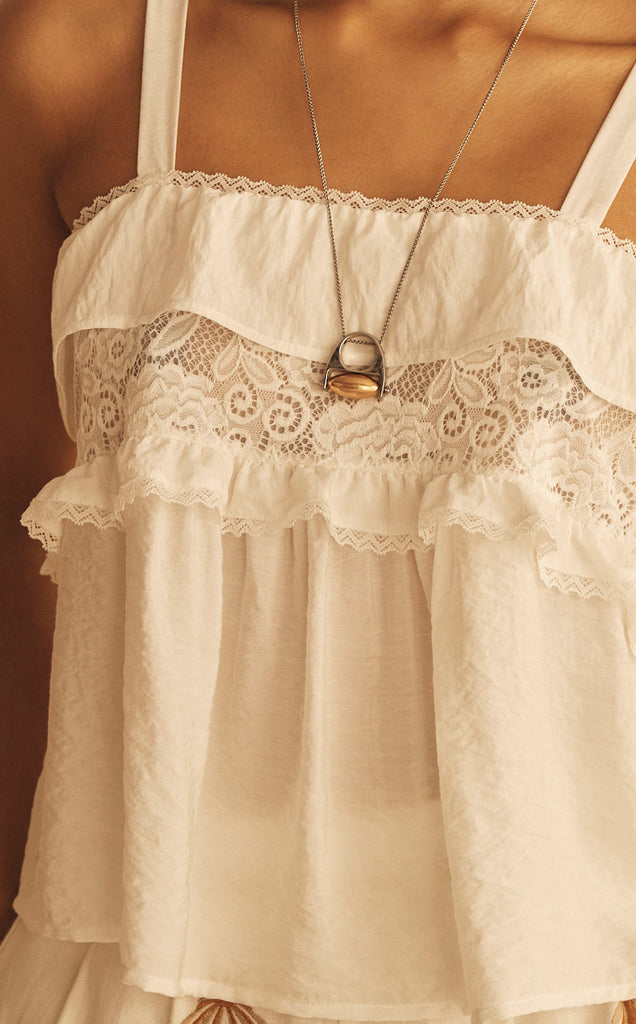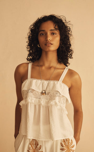 Feminine sophistication meets summer luxury in the Frill Lace Cami. Delicate lace detailing and soft frill accents elevate this timeless silhouette into a refined everyday essential. A lightweight crinkle cotton blend camisole featuring flattering square neckline, adjustable bra-friendly straps and beautiful drape to the hip. Pair with DALLA PALMA EMBROIDERED Pleated Harem Pant or DALLA PALMA EMBROIDERED Resort Short.