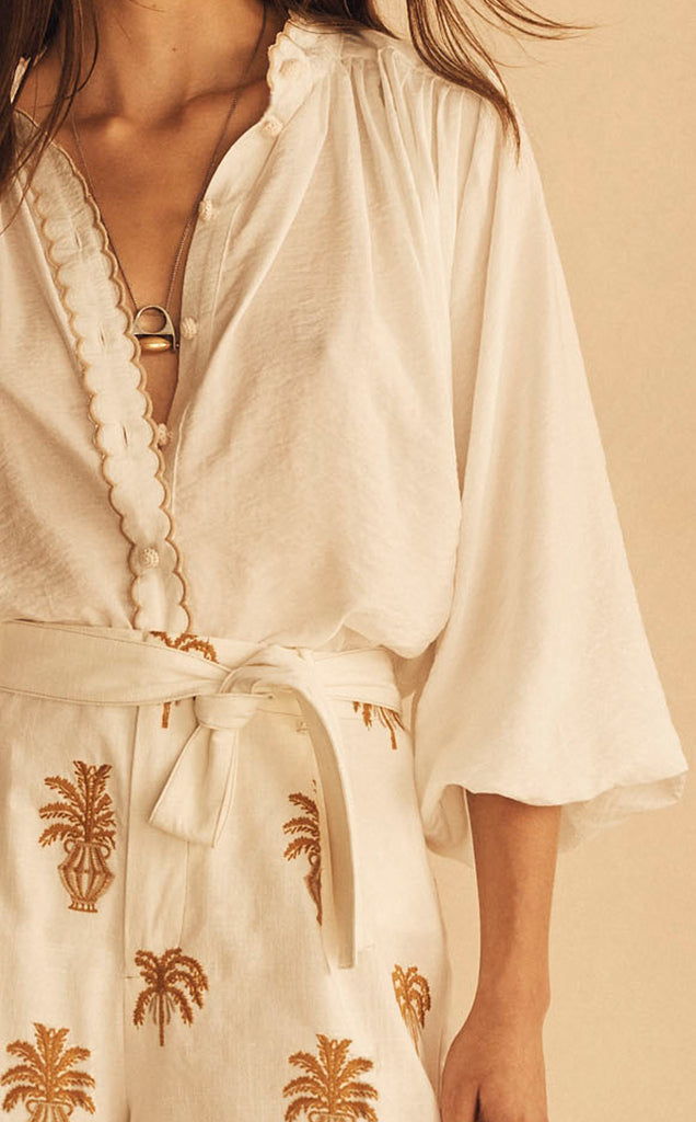The Scallop Billow Sleeve Blouse is a versatile foundation piece. Crafted from a lightweight, breathable crinkle cotton blend with contrasting stitched scallop trim detailing on front placket featuring crochet button down centre front and billow sleeves. Wear unbuttoned over your swimsuit, style with this season’s favourites or pair with DALLA PALMA EMBROIDERED Pleated Harem Pant or DALLA PALMA EMBROIDERED Resort Short.