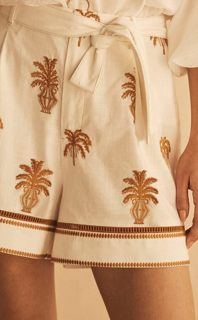 Effortlessly chic, the Resort Short is cut in a relaxed belted silhouette. Embroidered palm-tree inspired motifs and trim add an artisanal touch. The Resort Short features pleat detail, front zip opening and bordered hem with ladder trim accents. Style with matching Cuffed Short Sleeve Shirt or wear over this season’s favourite swim.