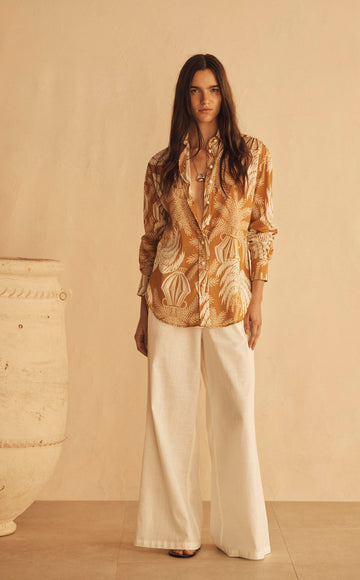 Luxe, airy and light, the Long Sleeve Shirt features a crochet button through front, collared neckline and long cuffed sleeves. Style with the Gathered Wide Leg Pant in DALLA PALMA or BIANCA, or wear open over this season’s favourite swim.